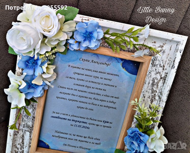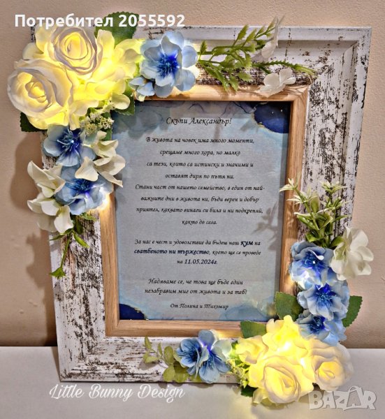 Рамката е подходяща и като подарък за Ваш близък. Може да се изработи със снимка или текст по желание за различни поводи.
