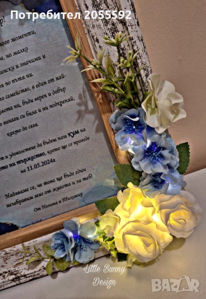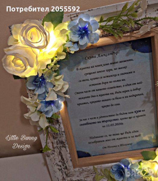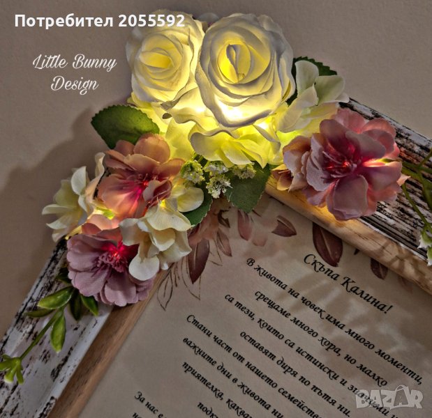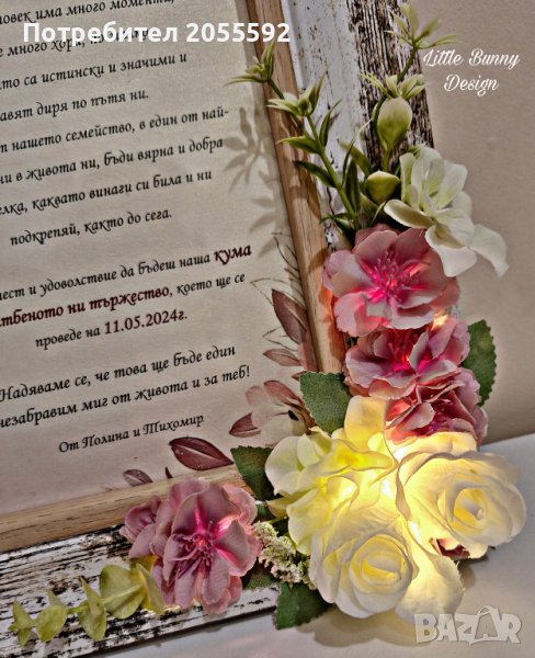 Поканата е с дървена рамка, декорирана с нежни цветя и осветление и може да се закачи на стена, но има и стойка.