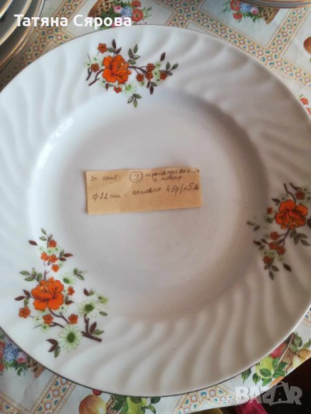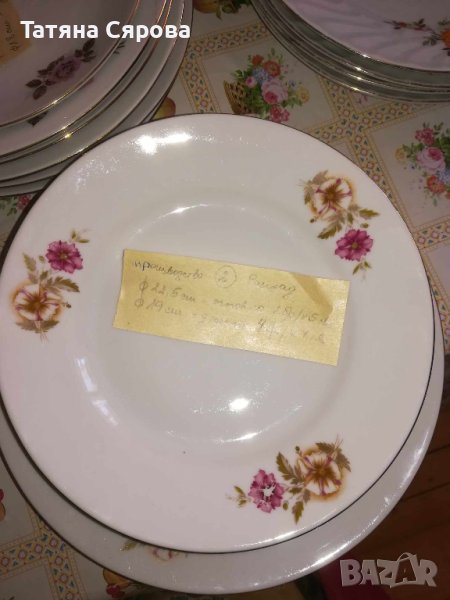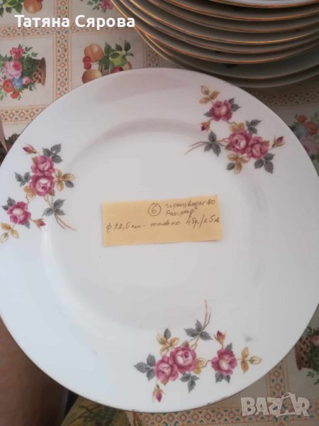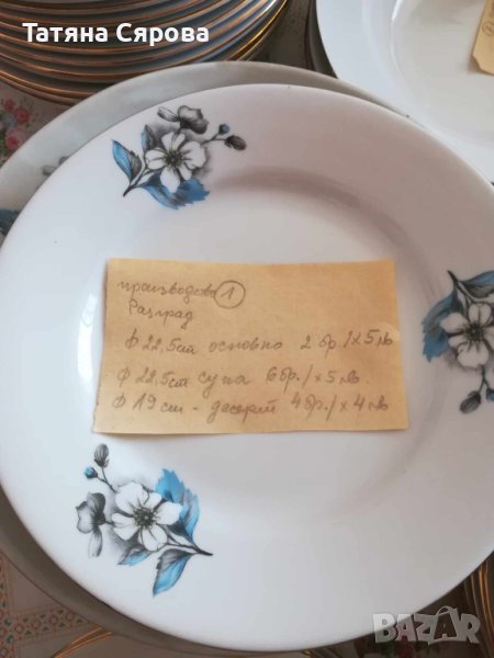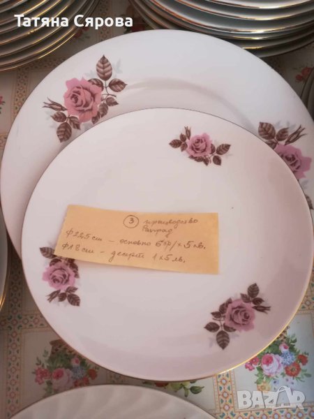 Всички чинии са със златен кант, използвани едни повече, други по-малко. Производство Разград.Върху всеки десен има бележка с броя и вида на чиниите. Всичко 13 шарки. N9 продаден.