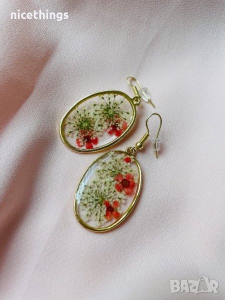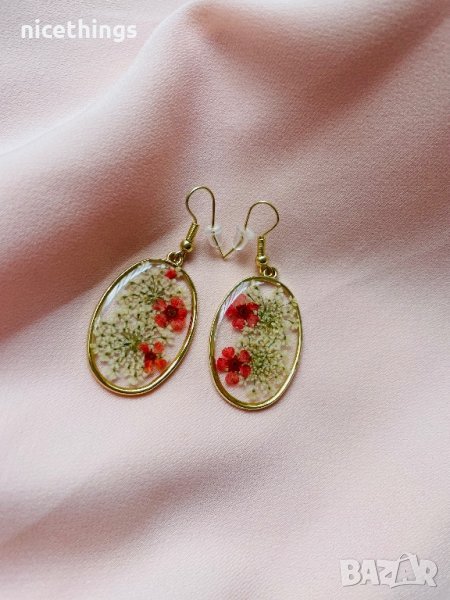 Нови обеци от епоксидна смола, сухи цветя и метални елементи.