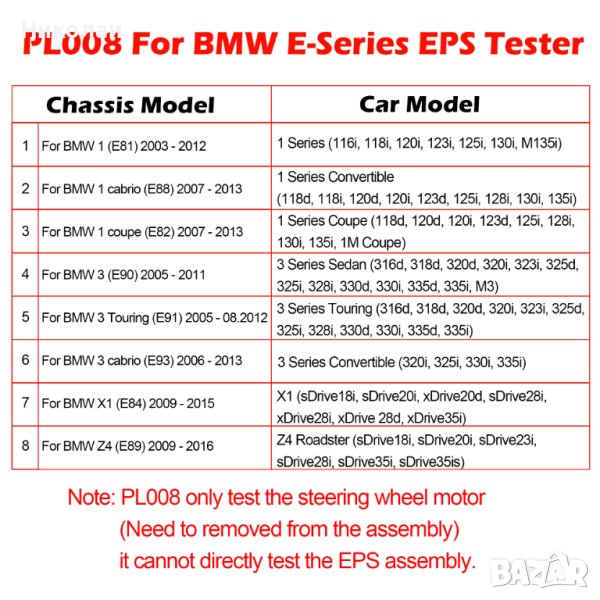 Стенд за електрически рейки (EPS) BMW E81 E82 E84 E88 E89 E90 E91 E93 Симулира сензор за въртящ момент за задвижване на EPS мотор, има букса за диагностика чрез която може да се чете рейката без да е монтирана на автомобила.