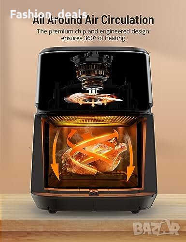 Фритюрникът е оборудван с усъвършенствана технология за нагряване, която осигурява 360° равномерна циркулация на въздуха. Това означава, че храната ви ще излезе хрупкава и златиста отвън, а отвътре ще бъде перфектно сготвена.
