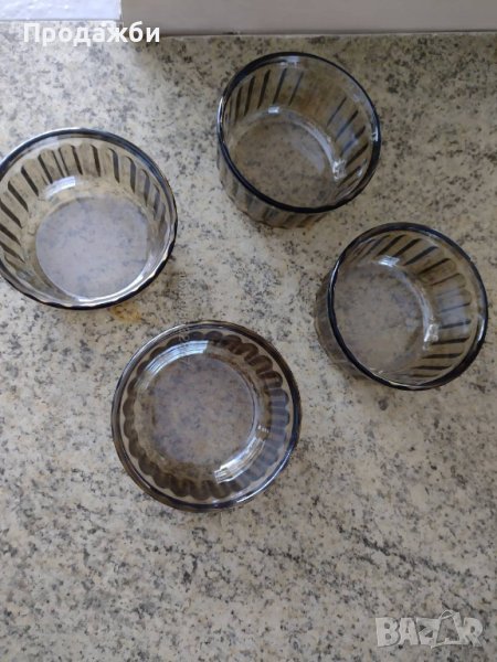 Продавам комплект от 4 бр. формички за крем- карамел или други видове десерти; материал: прозрачно стъкло в светло сив цвят; отлично състояние; размери: диаметър: около 8.5 см.; височина: около 4.5 см.; цената е за целия комплект.