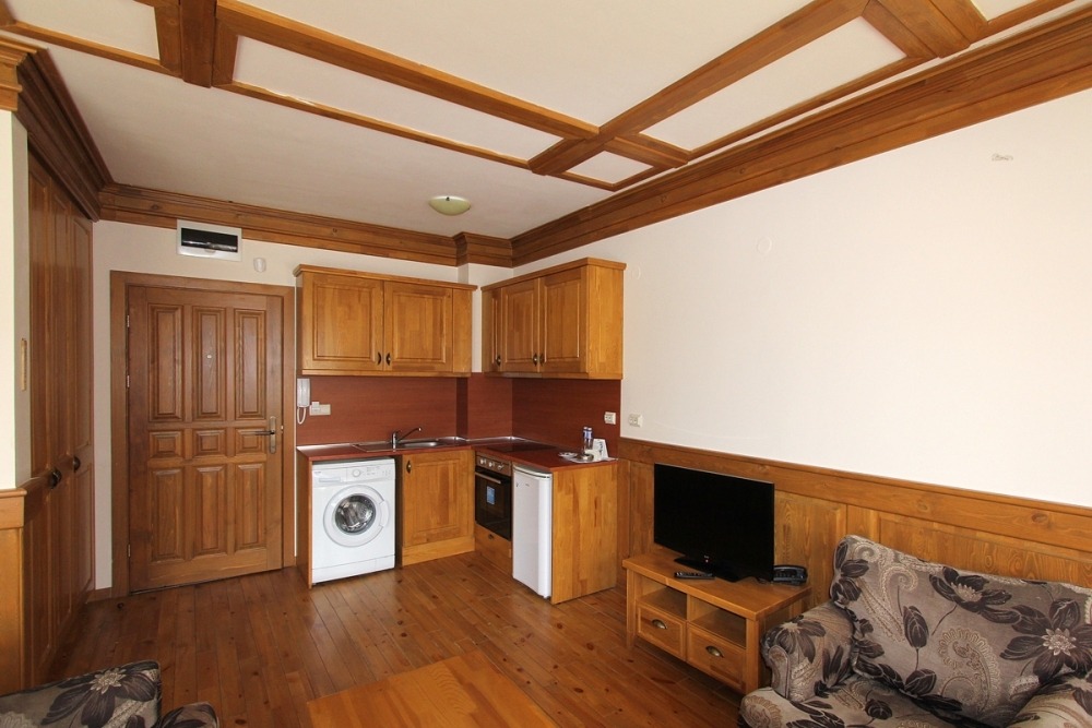 Предлага се напълно обзаведено с: кухненски кът с мебели от дърво, всички необходими уреди фурна, котлони, пералня, хладилник. Има трапезна маса за хранене със столове; разтегателен диван, холна маса, тв с шкаф; двойно легло с нощни шкафчета.
