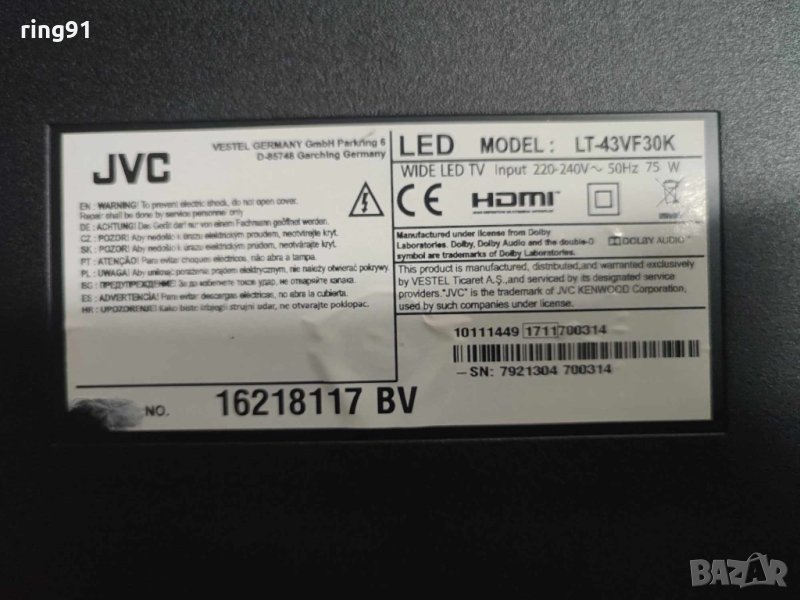 Телевизор JVC LT-43VF30K На части , снимка 1 - Части и Платки - 42523495 Телевизор JVC LT-43VF30K На части , снимка 2 - Части и Платки - 42523495 Телевизор JVC LT-43VF30K На части , снимка 3 - Части и Платки - 42523495 Телевизор JVC LT-43VF30K На части , снимка 4 - Части и Платки - 42523495 Телевизор JVC LT-43VF30K На части , снимка 5 - Части и Платки - 42523495 Телевизор JVC LT-43VF30K На части , снимка 6 - Части и Платки - 42523495 1/6