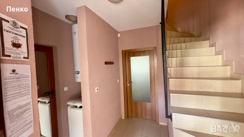 Първият етаж включва широка всекидневна с трапезария, кухненски кът, баня и просторна веранда с барбекю на дървени въглища. На втория етаж са разположени 3 спални, две бани и три балкона.
