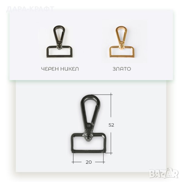Карабинките, с различни размери при основата, са подходящи за кожени и текстилни презрамки със същата ширина. Използват се от шивачи, любители "направи си сам" и хора, занимаващи се с художествени професии. Освен като презрамки и дръжки за чанти, те са чудесен аксесоар, който придава завършен и модерен вид на различни кожени и текстилни изделия. Карабинката позволява бързо откачане на ремъка от другата част на продукта, а въртящата се основа не позволява усукването му.