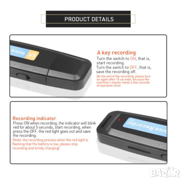 Дискретен и удобен за носене може да съхрани над 70 часа аудио записи, aко му се постави 32 GB карта памет.