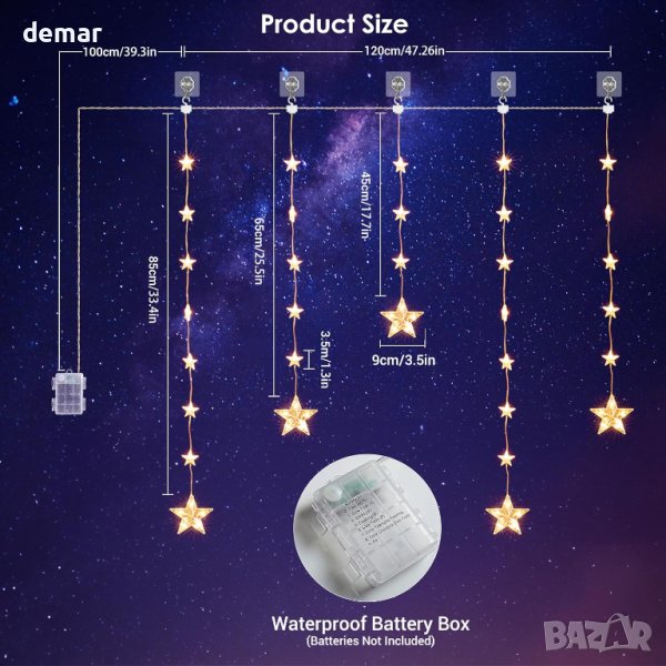 Elktry Christmas Star Lights: Насладете се на завладяващ дисплей от 32 лъчисти звездни светлини, съставени от 27 звезди, подобни на перли, и 5 изпъкнали искрящи, обещаващи хипнотизираща гледка от всеки ъгъл. Потопете се в надстройката за 2023 г., предлагаща разнообразни опции за осветление: от топла бяла атмосфера за семейно време до ярки празнични цветове за празнуване. Създадена за удобство, широката 1,2M струна разполага с 52 топли бели LED светлини, разположени на 30 см една от друга, всички с покритие за издръжливост. С 90-часов живот на батерията (3 AA батерии не са включени) и 24-часов таймер за цикъл (6 часа включени/18 часа изключени), тези безпроблемни светлини гарантират безопасност и дълъг живот. Тяхната гъвкавост блести, подходящи както за вътрешен, така и за външен декор (IP65), с дълъг проводник за гъвкавост при поставяне на кутията за батерии. Накарайте всеки ъгъл на вашия дом да заслепи със звездния блясък на Elktry.
