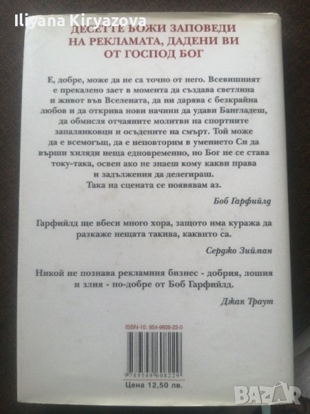 Боб Гарфийлд е най-прочутият и най-влиятелен рекламен критик. Седмичната му рубрика в "Ад Ревю" в "Ад Ейдж" е в състояние да издигне до небесата или да сравни със земята всяка рекламна кампания. Това го е превърнало в най-страховитата фигура в света на маркетинга.Но той също така е най-остроумният, най-проницателният и най-забавният човек в същия този свят. И доказателството за това е "Десетте Божи заповеди на рекламата". В резултат от тази книга рекламата може да стане по-добра, може и да не стане по-добра, но определено няма да остане същата.Състояние: отличноИздател: BookmarkБрой страници: 220Година на издаване: 2014Корици:твърдиЕзик:българскиКатегории: Маркетинг, реклама и PR, Икономика, Книги