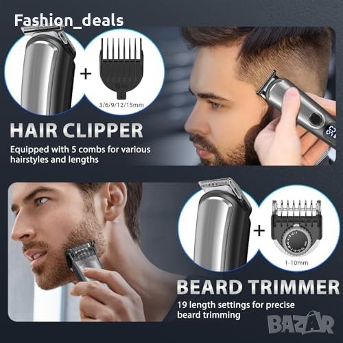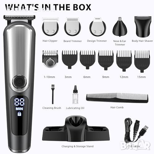 Множество дължини на подрязване с 5 стражника за коса (3/6/9/12/15mm) и регулируем гребен за бради (1-10mm с 0.5mm интервали).