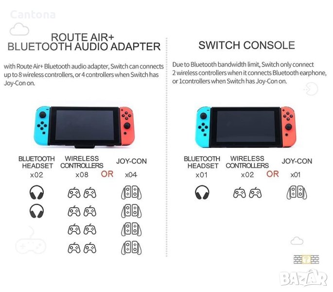 - Версията Route Air Pro поддържа гласов чат в играта с приятели за игри като Fortnite. Модернизираният безжичен стерео bluetooth предавател с aptX технология с ниска латентност за Nintendo Switch, никога повече не се свързва с кабел, идеално решение за активиране на не-Bluetooth Switch, свързан към слушалки с bluetooth приемници, безжични слушалки за игри и Bluetooth високоговорители.