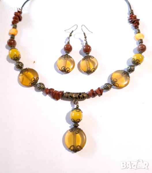 Прекрасен комплект бижута в Бохемски стил с красиви жълти камъни Цитрин, естествен жълт седеф, кафяв Яспис и Слънчев камък с орнаменти в цвят Античен бронз.