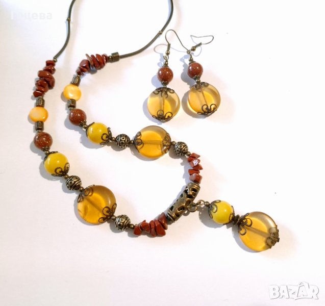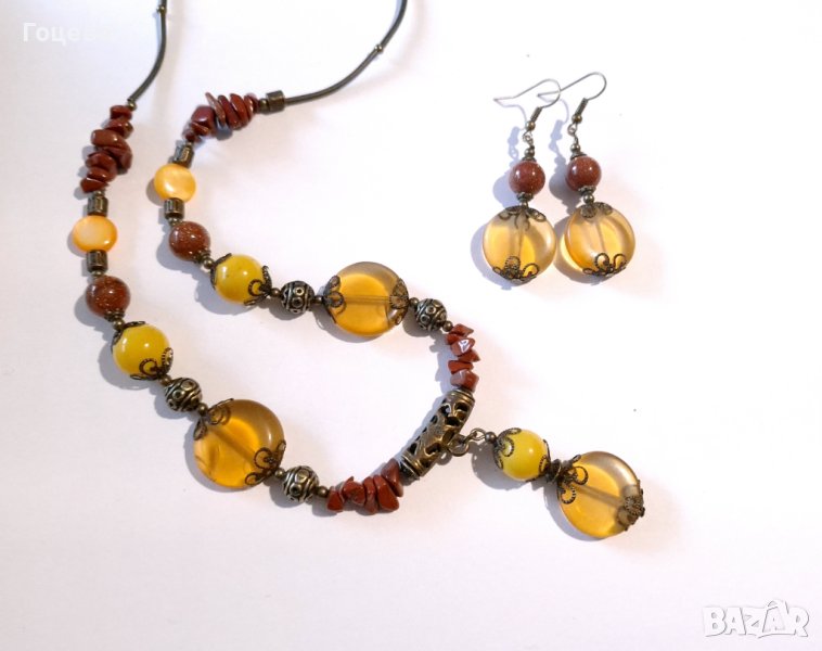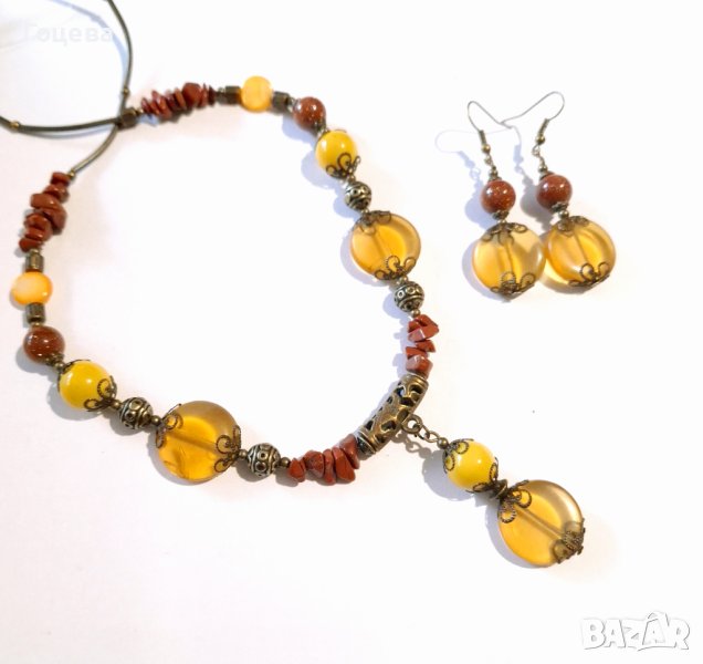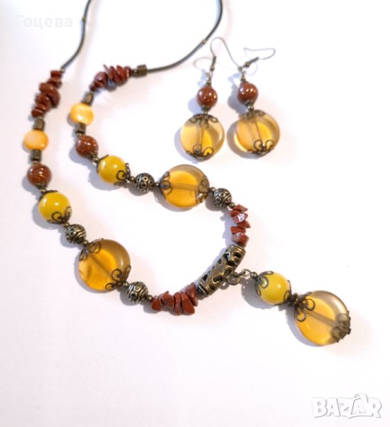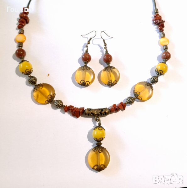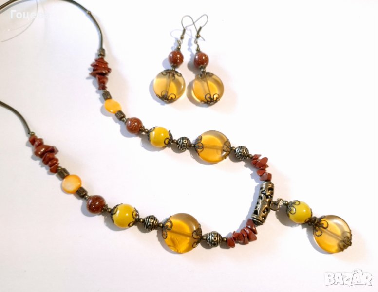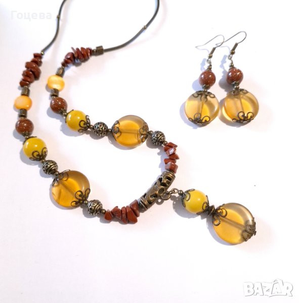 Уникален Бохо комплект бижута обици и колие с камъни Цитрин, Седеф,Яспис,Слънчев камък