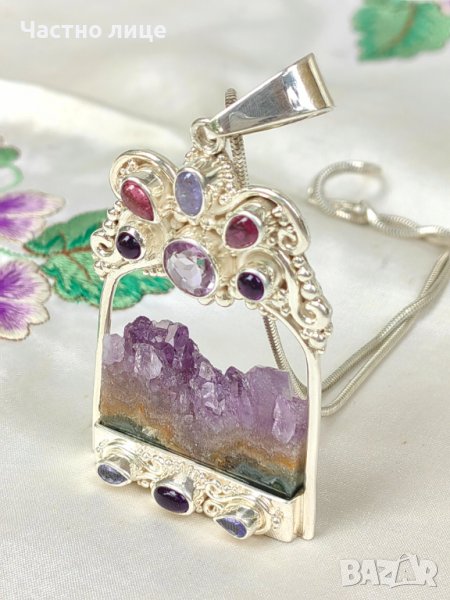 Голям Сребърен Марков Vintage Медальон SAJEN Jewelry от Остров Бали с ДРУЗА АМЕТИСТИ, флуорити и аквамарин - неизползван.