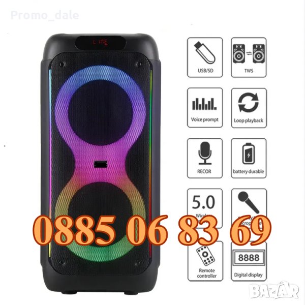 вграден акумулатор, безжичен микрофон. Възпроизвежда файлове Мр3 формат от флашка USB или SD карта, BLUETOOTH, РАДИО + СВЕТЛИННИ ЕФЕКТИ.
