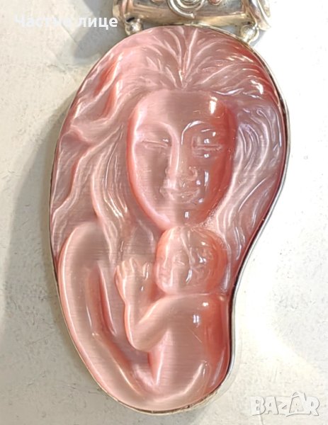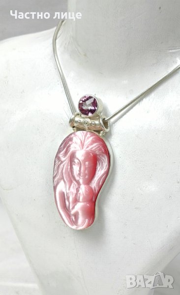 Бали с Икона на Дева Мария с Младенеца, ръчно изрязана и гравирана върху розов Родохрозит котешко око, а най-горе има вграден ръчно изрязан висше качество аметист.
