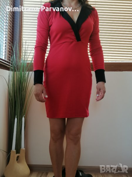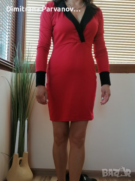 Дамска червена рокля с дълъг ръкав. Номерът е S/M. Обличана е само веднъж на повод.