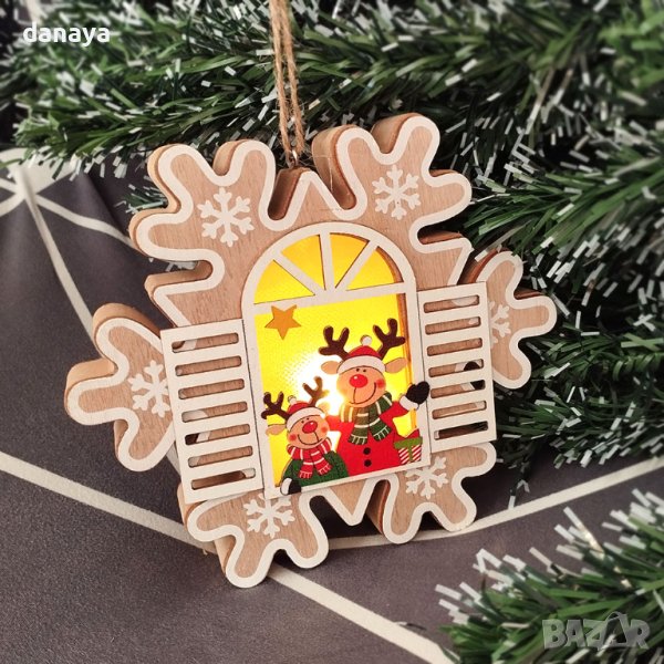 4136 Дървена светеща коледна играчка за окачване Снежинка