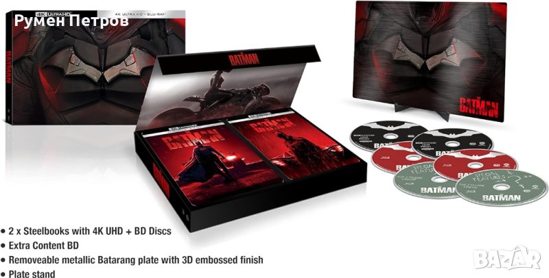 Продавам ново неразпечатано специално лимитирано колекционерско луксозно издание THE BATMAN - Special BATARANG Double Steelbook Limited Edition - 4К + блу рей комплекта съдържа 2 отделни различни стилбука, всеки от които съдържа 3 диска: един 4К и 2 блу рей, има БГ субтитри на всеки от блу рей изданията - внос от Англия