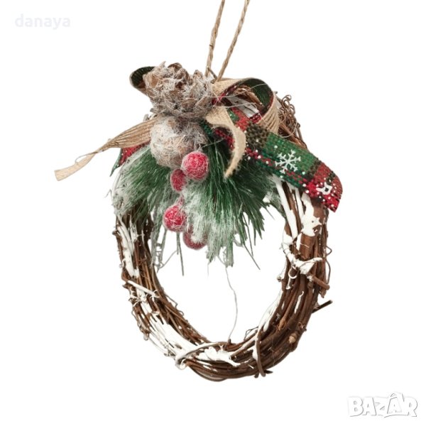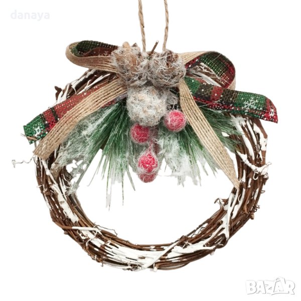 Красива коледна украса за входна врата или стена. Коледен венец, декориран с елхова клонка и панделка. Основата на венеца е изработен от естествени материали, с връвка за закачане.