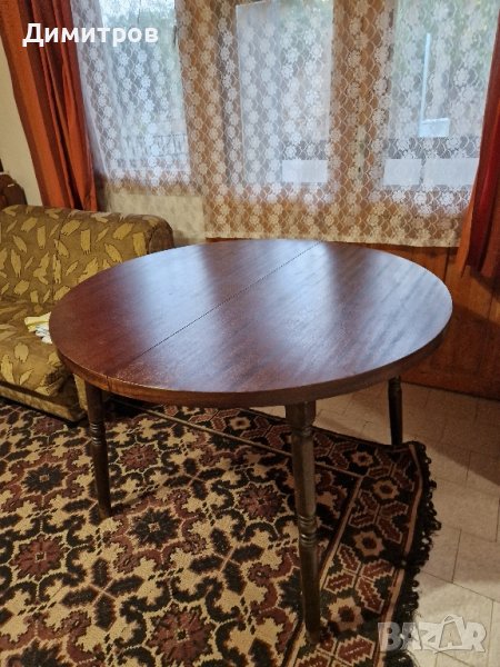 Отлично запазена масивна разтегателна трапезна маса с диаметър 110см. (150 при разтегнато състояние).Масата се намира в с. Отец Паисиево, обл. Пловдивска.. Възможен е и транспорт до гр. Пловдив след капариране.