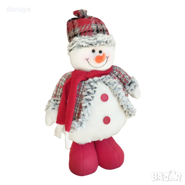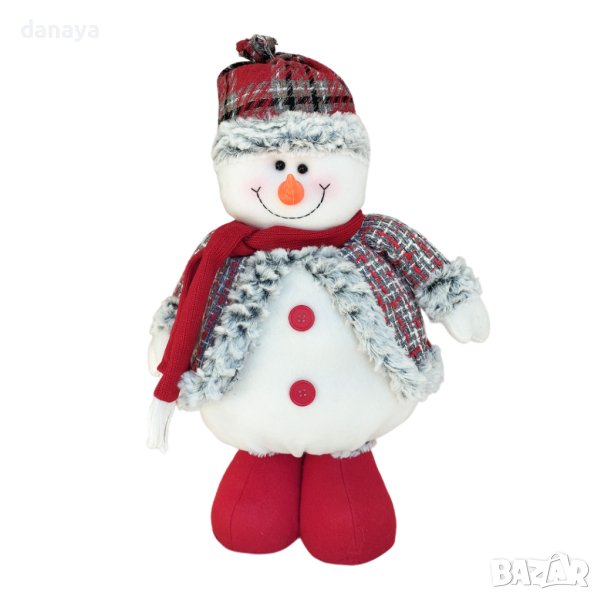 коледна фигура от плат Снежко с разтягащи се крака. Коледна декорация, симпатична и красива! Прекрасен коледен декор, където и да го поставите. Снежко е с променяща се височина, когато е със сгънати крака, височината е 47см, а когато разпънете краката му, Снежко става висок около 78см. Направен от плат. Изработен от много мекичка и приятна на допир материя.