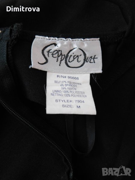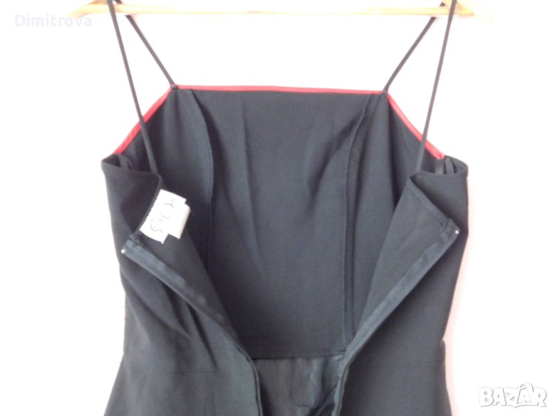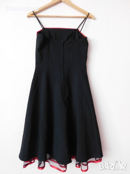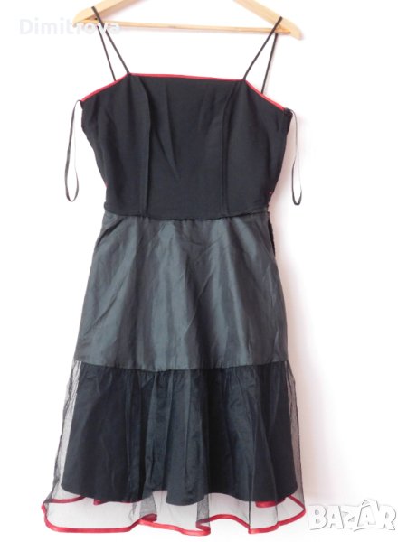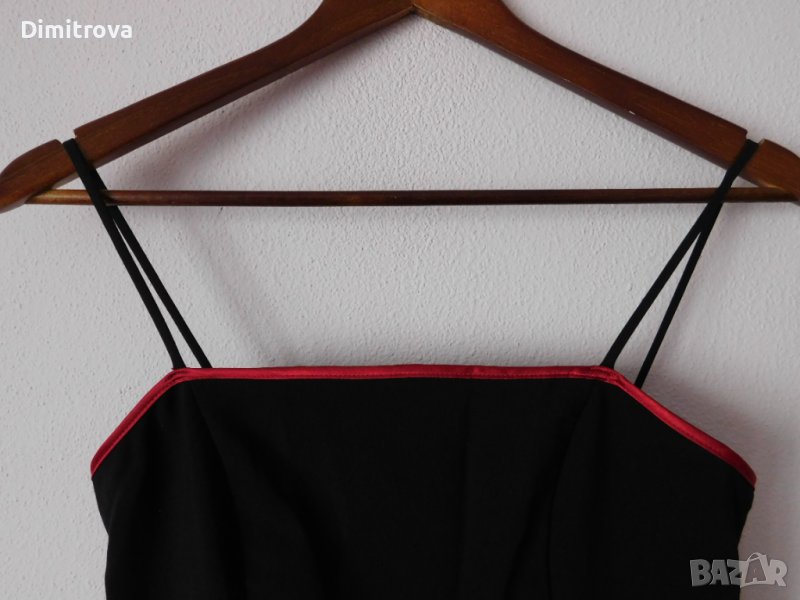 Стилна рокля в черно, с тънки презрамки и обточване с червен плат по деколтето и подгъва. Долната част е допълнително оформена с хастар и тюл.Роклята е с оформяща фигурата кройка, която се разширява надолу.В областта на талията са поставени гайки заколан, но аз не съм слагала и роклята се предлага без такъв.