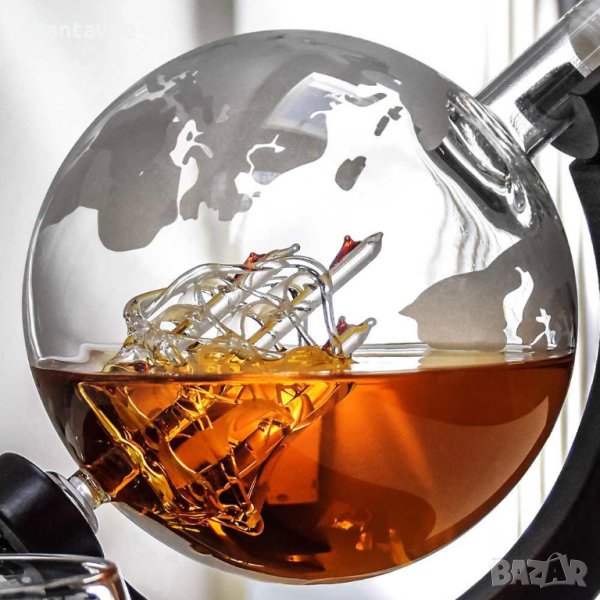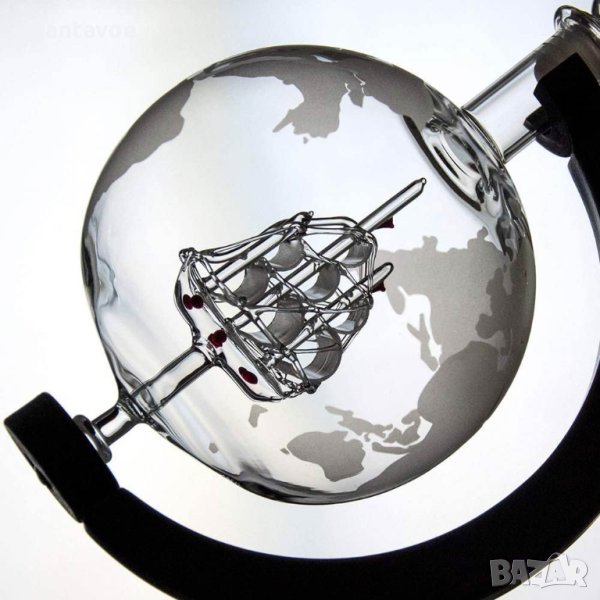 Декантерът е с изображение на картата на света отвън, а вътре има красива фигура на кораб.