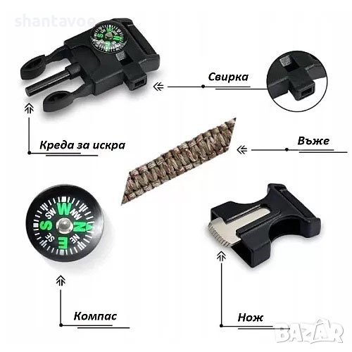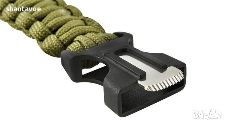 нестандартна и мултифункционална е – не е просто гривна, а се състои от въже и вградени нож, компас, свирка и магнезиева пръчка;