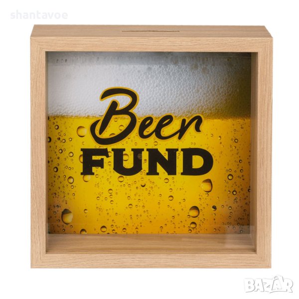 интересен дизайн – дървена кутия с картинка на хмелната напитка и надпис “Beer Fund”;