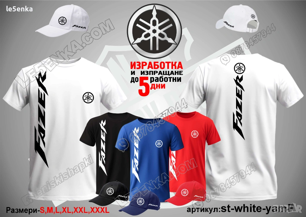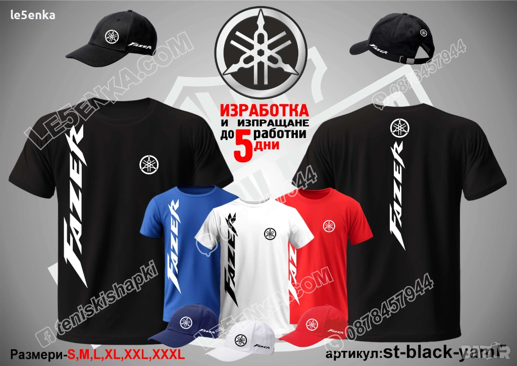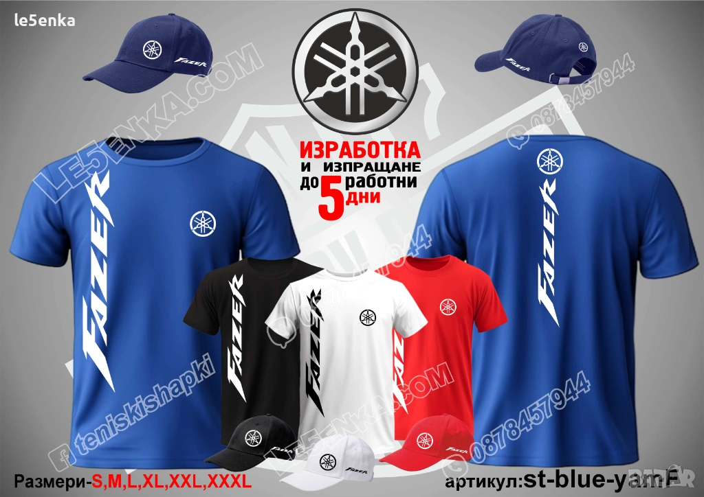 Посочената цена е за шапка и тениска комплект. Само шапка - 18 лв. ,а само тениска - 32 лв. Тениските са изработени от качествена памучна материя - различна номерация и цветове - черен, син, червен и бял. Шапките са памучни с метален клипс или коланче за регулиране - тип бейсболни. Последната снимка в обявата е на таблица с размери за тениските. Изпращаме по Еконт. Le5enka.com