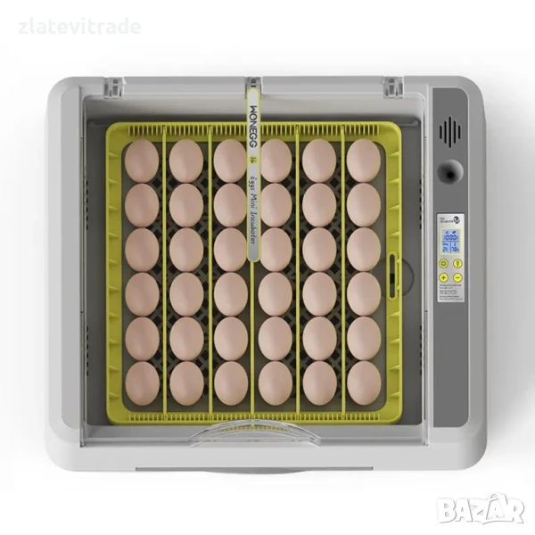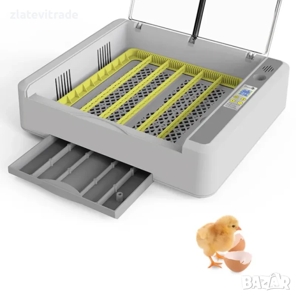 Модерен инкубатор за 36 яйца със сензорни бутони и вграден овоскоп. Инкубатора за яйца включва цифров дисплей за показване на температура, влажност и броене на дни; 2 бутона за задаване на температура и автоматично завъртане, лесен за контролиране от начинаещи.