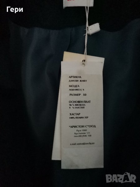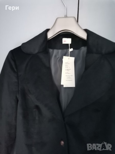 Сакото е ново, с етикет, размер 50 по етикет, според мен отговаря на М. Материята е много приятна, подобна на плюш. Размери - рамене - 40 см, дължина - 61 см, подмишници - 48 см, има лека еластичност.