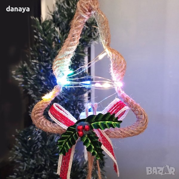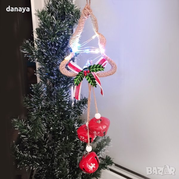 Висяща коледна декорация за стена или врата – светеща елхичка с 3 червени звънчета. 3 режима на светене в многоцветни светлини. Чудесна коледна украса, ефектна и красива, където и да я закачиш.