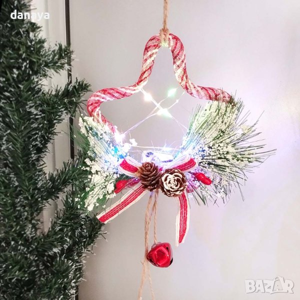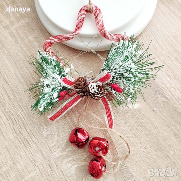 Висяща коледна декорация за стена или врата – светеща звездичка с 3 червени звънчета. Звездата е красиво декорирана с елхови клонки, които са обсипани със сняг.