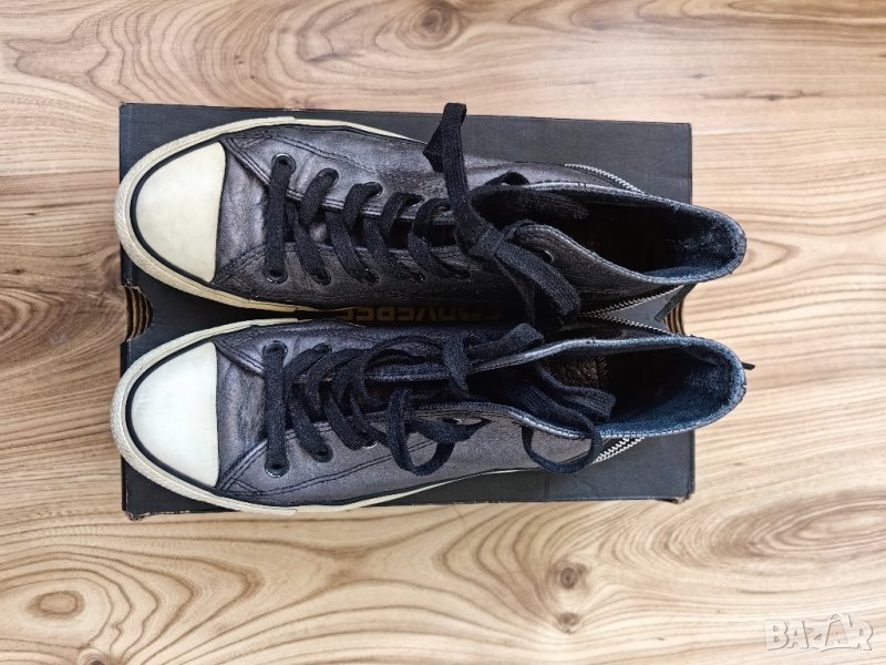 Дамски кецове CONVERSE оригинал и, номер 39 (24.5см). Горната част е от сребриста, тъмно сива естествена кожа, много запазени. Произведени във Виетнам. С оригиналната кутия.