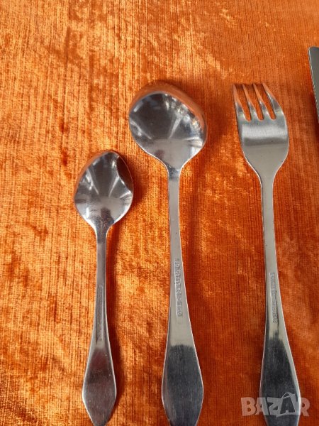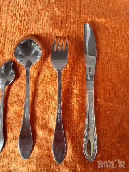 Стари прибори за хранене,състояние видно на снимките много запазени, същите са за почистване. Комплекта е от 4 бр.малка и голяма лъжица,вилица и нож.