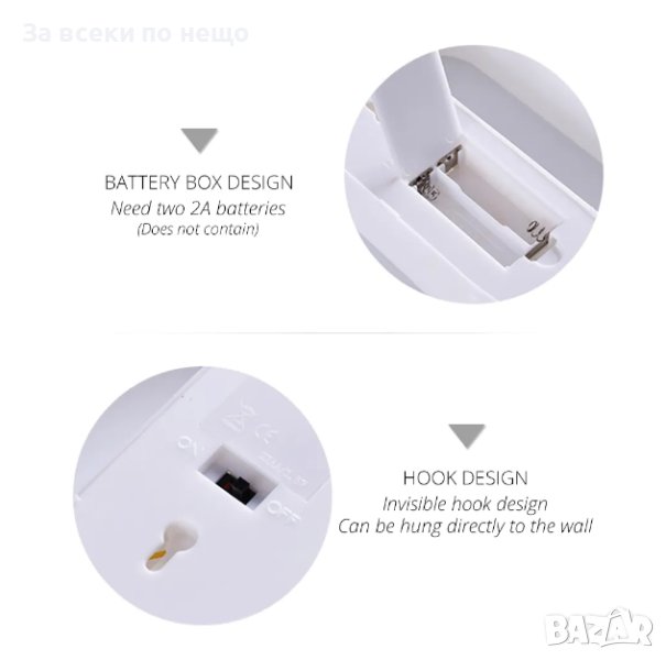 Подходяща както за поставяне върху плоскост, така и за закрепяне за стена. Изработени са от пластмаса с меко светещи лед светлини в топъл бял цвят. Артикулът е на батерии – 2 броя АА. Към него не са включени такива.