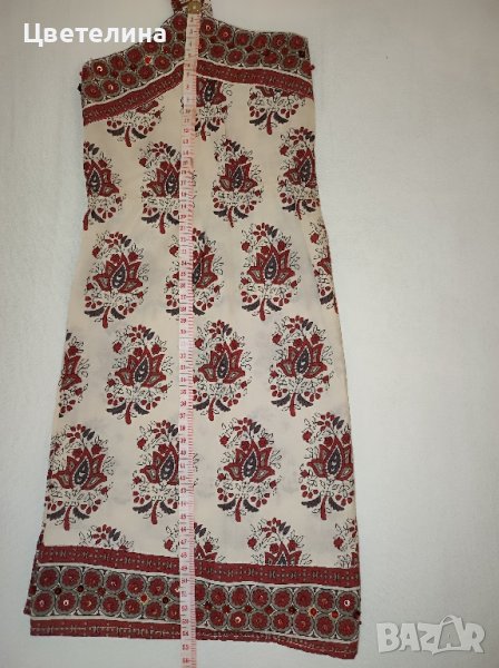 Под бюста е с ластик.На гърба също има ластик.Свободна кройка.