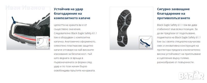 Целостта на краката ви е от съществено значение. Следователно Black Eagle Safety 61.1 low е оборудван с композитна капачка. Анатомично оформеното, олекотено пластмасово защитно капаче отговаря на най-високите изисквания за безопасност, тъй като веднага се връща в първоначалната си форма след удар и по този начин бързо освобождава пръстите на краката.