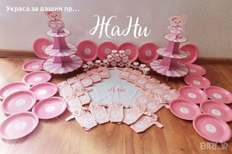 Украса За бебешка погача на тема Мечета*стойка за мъфини и сладки* чинийки* салфетки боди* малка кърпичка за паричките с име* бурканче с мед подаръчета за гостите