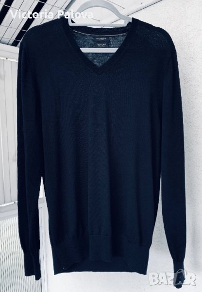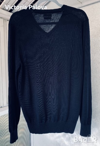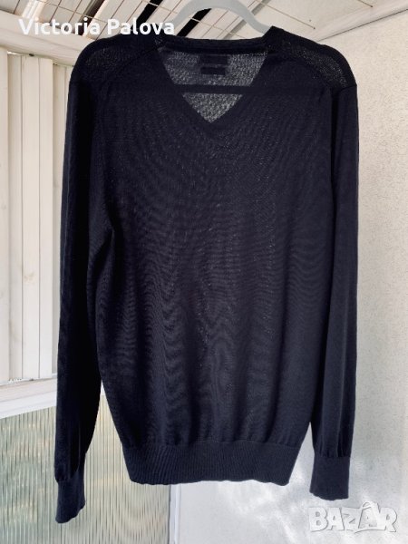 Изискана мъжка мода лукс, Италия, пуловер от много тънък меринос, тъмносин до черно, разтеглив. Рамо - 44см, ГО - 55см, дължина - 74см, ръкав - 70см.