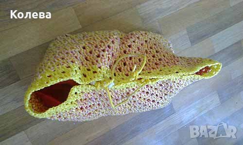 642. Плажна чанта Интересна плажна чанта с голяма вместимост. Изплетена от здраво и твърдо жълто лико. Ярко червена копринена подплата с шнур за затваряне на багажа. Твърдо дъно, със същата подплата, леко извито от неподходящо съхранение. Не пречи на