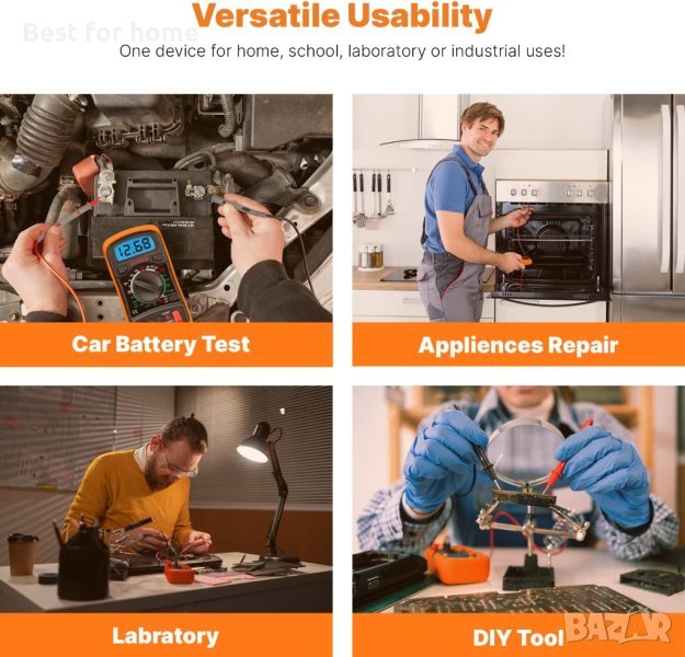 【МНОГОЦЕЛЕВА УПОТРЕБА】 Компактен цифров мултиметър, идеален за търговска и домашна употреба. Работи като волтметър, амперметър, омметър за тестване на непрекъснатост, AC/DC напрежение, диод, транзистор HFE, тестер за автомобилни акумулатори