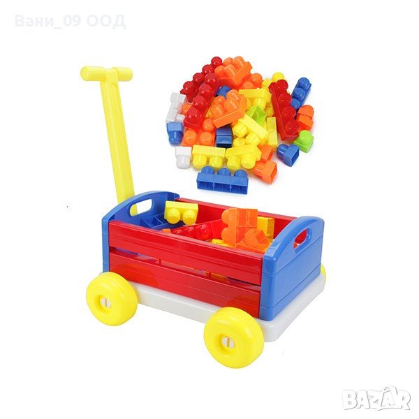 Комплектът съдържа 50 елемента на конструктор и количка с размери 38.5 * 31 * 42.5 см (измерени с дръжката).