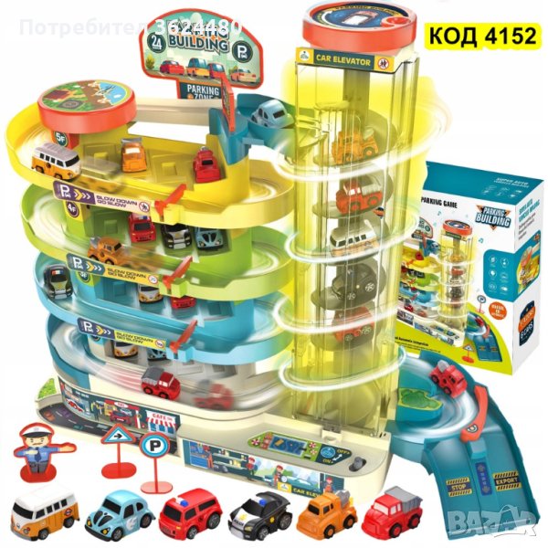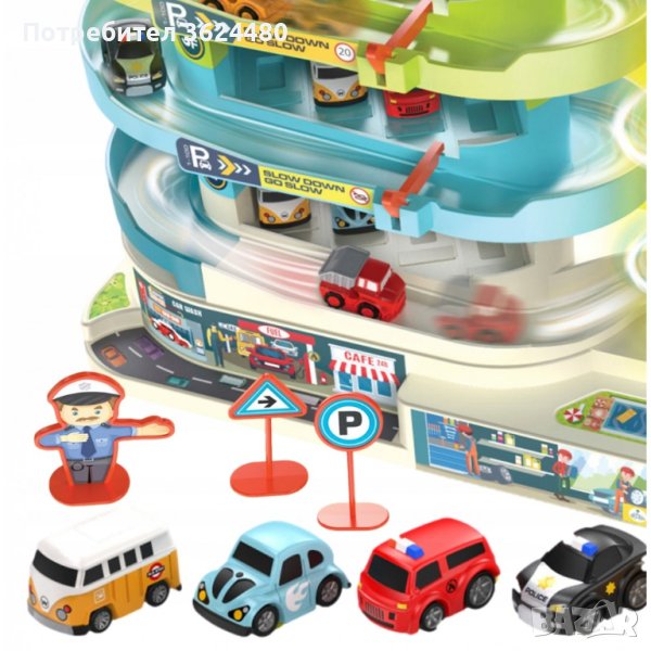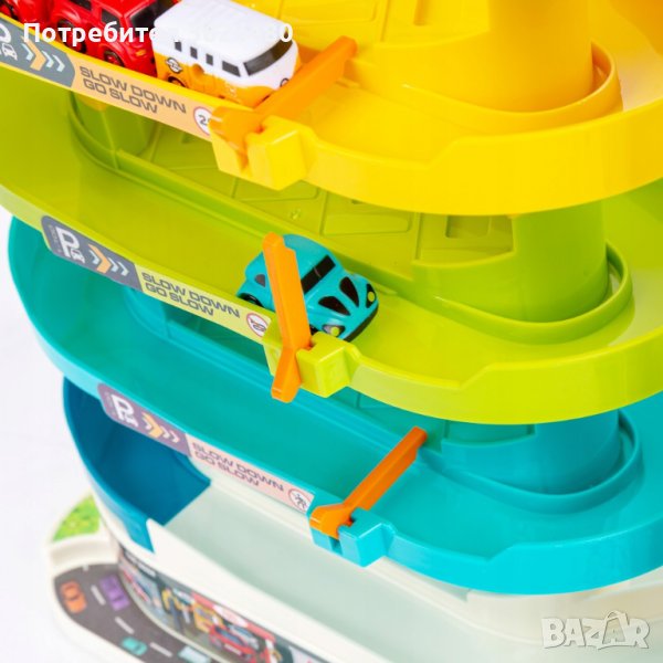 Паркингът разполага с до 5 нива, които са предназначени за паркиране на автомобилите, които можете да намерите в комплекта. Колите стигат до върха с помощта на автоматичен асансьор.