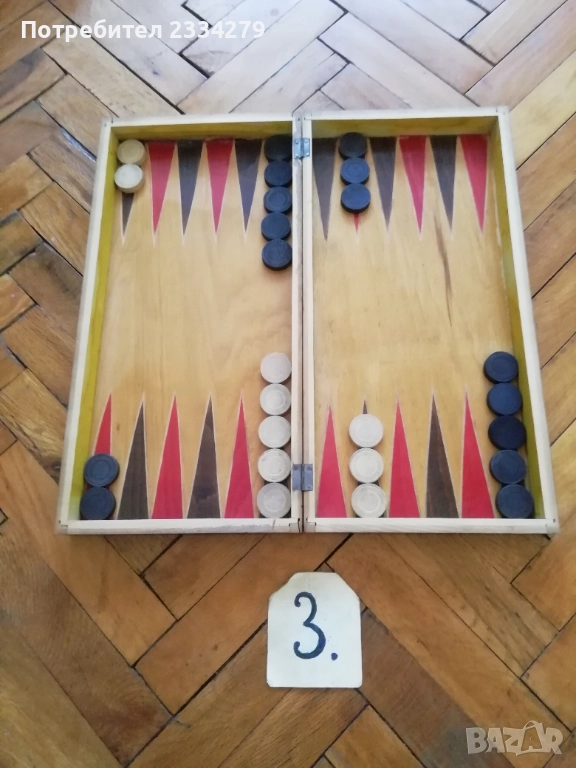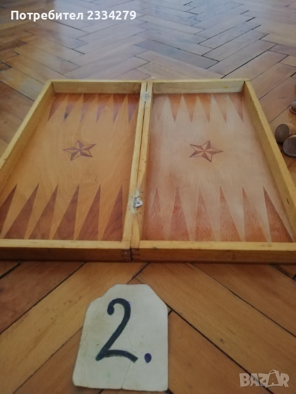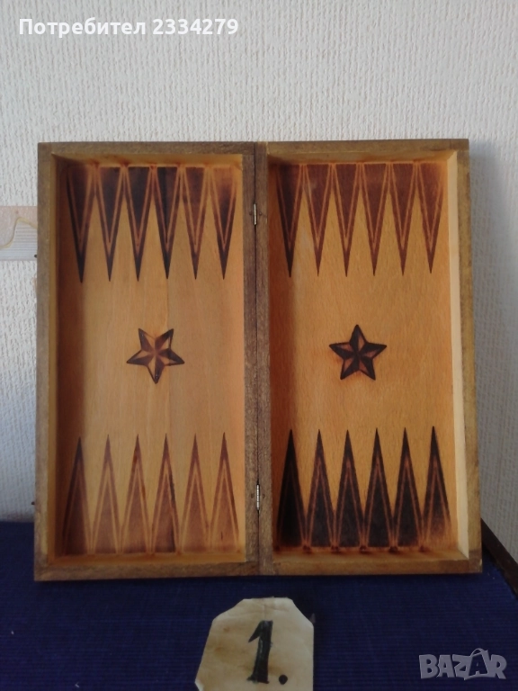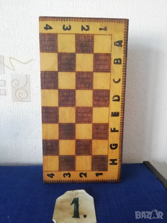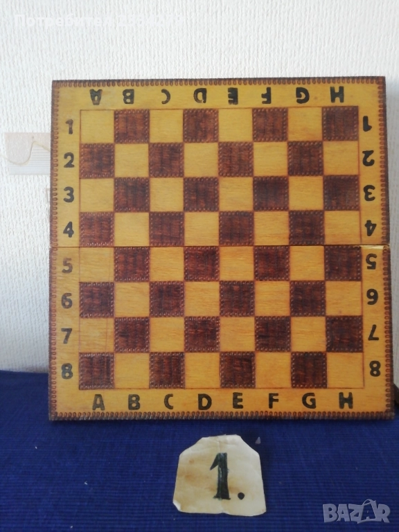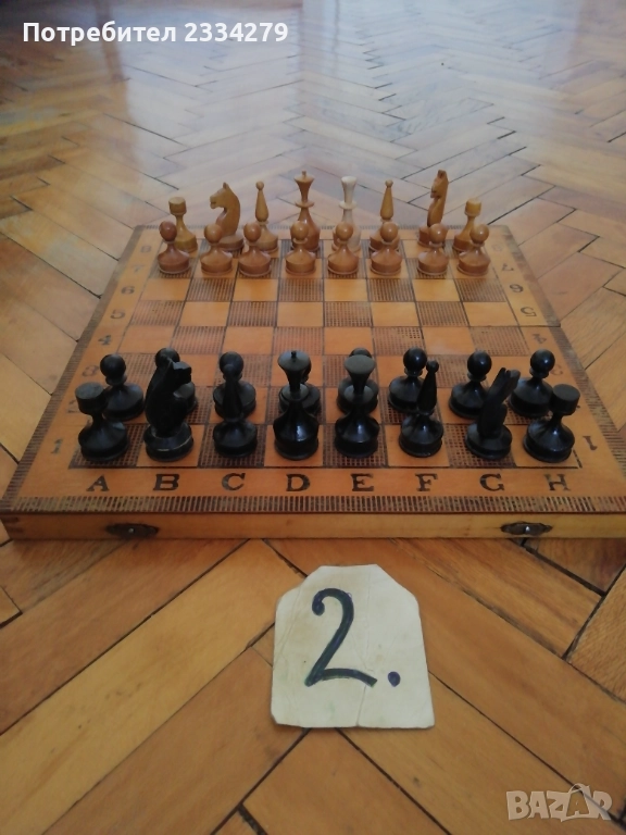N:1 много добре запазен шах изцяло от дърво, перография от 80-те години,размери 34х34см., цена 23€.; N:2 шах и табла изработени през 70-те години на СОЦА, дървена кутия с размери 34х34см. ,фигурите от дърво, перография щампа, (има забележка дървото около пантата, но се отваря и затваря нормално) цена 15€.;