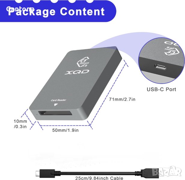 - Професионалният четец за XQD и CFexpress Type B се доставя с USB A към USB C кабел, предназначени да позволят на едно устройство да бъде съвместимо с всички разновидности на MacBook Pro, Mac Air, компютър, преносим компютър и други.