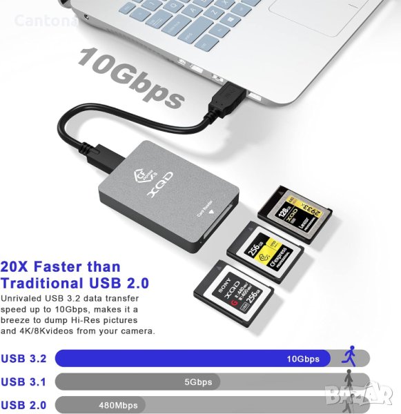 - Поддържа прехвърляне на данни от карта с памет XQD и CFexpress Type B. Прехвърляйте изображения с висока разделителна способност и видеозаписи към вашия компютър по-бързо и по-ефективно с високоскоростен USB 3.1 трансфер на данни от 10 Gbps. USB 3.1 е обратно съвместим с USB 3.1 Gen 1 и USB 3.0.